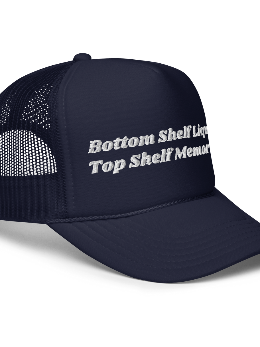 Top Shelf Memories Rope Trucker• 100% polyester front• 100% polyester mesh back• Structured, 5-panel cap, high-profile• Matching color braid and sweatband• Adjustable plastic snap• One size fits most